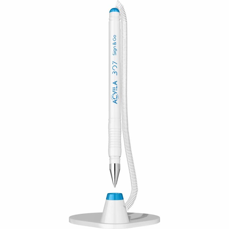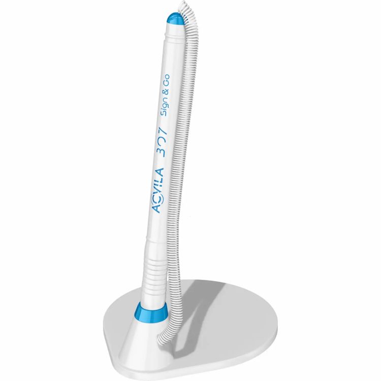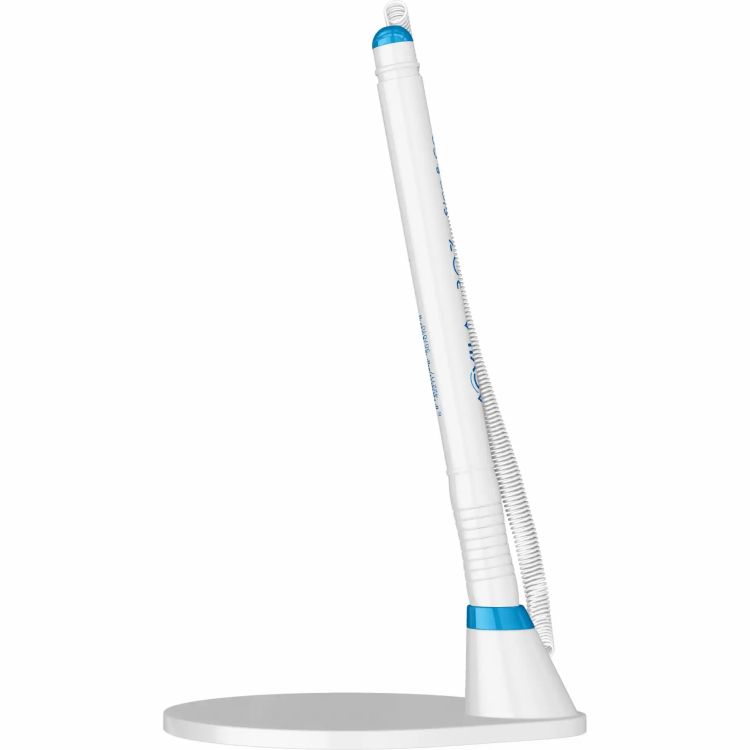 Pix din plastic cu suport de birou circular, auto-adeziv din plastic lucios cu diametru generos ce permite personalizarea cu orice sigla/ mesaj de dimensiuni potrivite pentru o vizibilitate optima, cu snur plastic robust si extensibil in culoarea minei, varf mediu de 1mm, mina interschimbabila albastra.