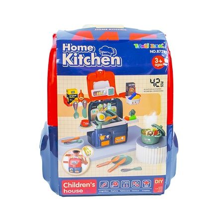 - Setul contine: 1 ghiozdanel, bucataria - aragaz cu plita, blat, chiuveta si etajera (se asambleaza din 14 piese), tigaie cu capac, cratita cu capac, 4 legume, 1 ochi de ou, 1 sticla, 2 farfurii, 2 linguri, 2 cutite, 2 furculite, 2 palete, 5 cutii din carton, 1 folie cu autocolante.