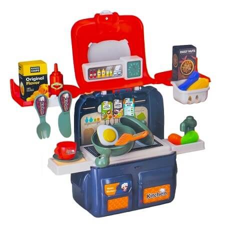 - Pentru usurinta in transportul jucariei, bucataria se poate transforma in ghiozdanel, atunci cand este pliata si i se atasaza curelele.
