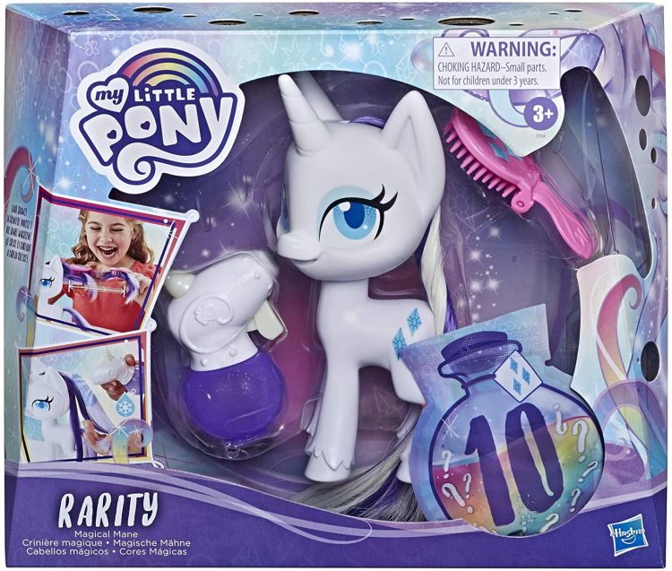 Dezvaluie magia cu personaul ponei Rarity! Aceasta figurina Magical Mane Rarity este o jucarie de ponei alba cu par care creste si isi schimba culoarea. Periati-i coama si coada cu accesoriul de perie inclus pentru a le vedea crescand. Apoi, umpleti accesoriul sticlei de pulverizare cu apa cu gheata si pulverizati-i parul pentru a face culorile albe sa se schimbe in albastru (utilizati doar apa curata de la robinet). Parul cu radacini extra-lungi al figurinei Rarity este moale si foarte potrivit pentru periaj si coafare. Figura vine si cu 10 accesorii surpriza pentru par. Deschideti pachetul cu teme de sticla de potiune si turnati accesoriile pentru coafarea parului ei lung periat! Jucaria Magical Mane Rarity prezinta un factor de forma reinventat intr-o scara mare, de 16. 5 cm, pentru o abordare proaspata si adorabila a designului original al personajului in divertismentul My Little Pony.