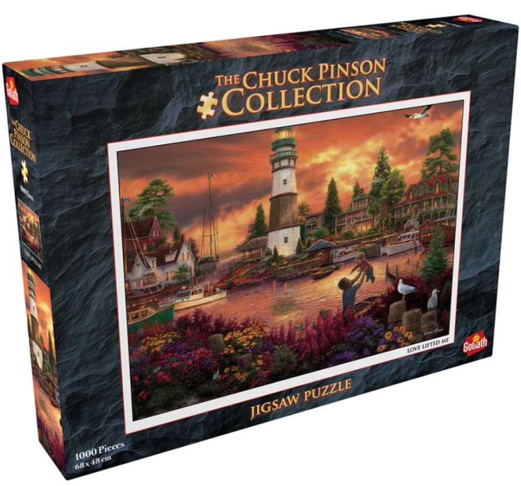 Puzzle Chuck Pinson - Dragoste pana la cer surprinde farmecul unui apus plin de emotie, unde farul vegheaza asupra tarmului si inimile se unesc sub cerul colorat. O imagine plina de speranta si frumusete, ideala pentru clipe de relaxare.