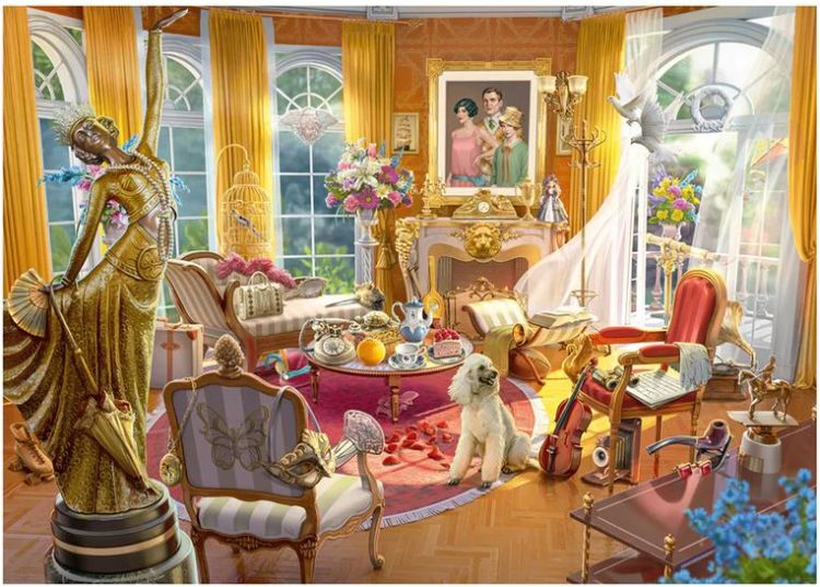 Puzzle Schmidt: I. Journey - Salonul de pe mosie, 1000 piese - o provocare cu adevarat interesanta pentru iubitorii de puzzle-uri si enigme. Poza de pe cutie nu este completa. In timp ce rezolvam puzzle-ul, putem descoperi 15 detalii pe care nu le-am putut vedea pe cutia acestuia.