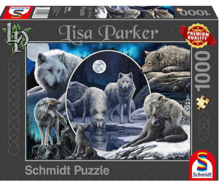 Puzzle Schmidt: Lisa Parker -Lupii magnifici contine 1000 de piese de puzzle. O ilustratie extraordinara despre lupi, in care putem descoperi diverse momente din viata acestora: lupii sub luna plina, lupii indragostiti, lupii care se odihnesc, respectiv lupii care se hidrateaza din apa lacului. Veti putea descoperi fiecare moment in parte, rezolvand puzzle-ul pas cu pas!