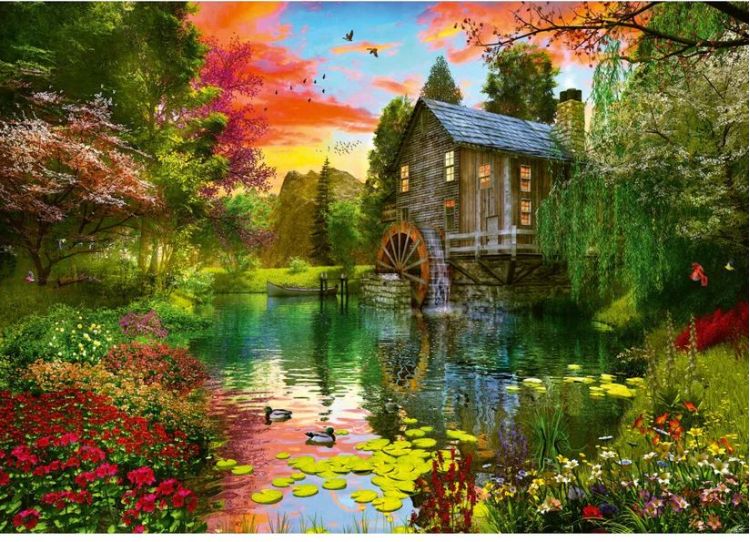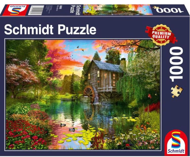 Puzzle Schmidt: Moara de apa contine 1000 de piese de puzzle. Undeva pe un lac minunat in apus de soare de primvara spre vara regasim o moara de apa, o inventie minunata realizata din materiale traditionale perioadei - piatra de rau si lemn local. Merita incercat acest puzzle!