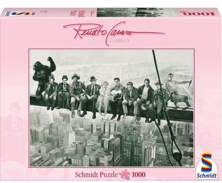 Puzzle Schmidt: Renato Casaro - Pauza de filmare contine 1000 de piese de puzzle. Puzzle-ul ilustrat de Renato Casaro prezinta mai multe vedete de la Hollywood precum: Marilyn Monroe, Stan si Bran, Elvis Presley, Charlie Chaplin etc intr-o situatie inedita asezati pe un stalp tinut de o macara. Mai mult acestia sunt insotiti de o gorila, care face acest puzzle si mai haios.