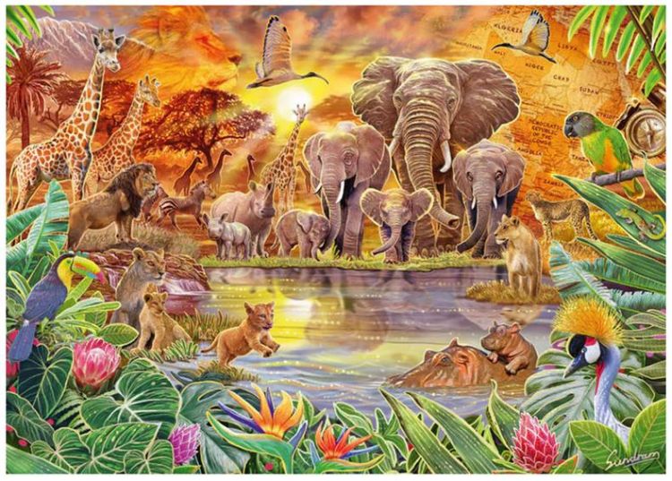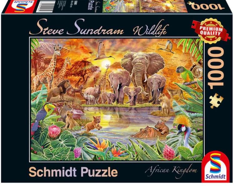 Puzzle Schmidt: Steve Sundram - Animale salbatice din Africa contine 1000 de piese de puzzle. Acest puzzle prezinta viata din salbatica a Africii intr-un mod foarte dragalas. O ilustratie minunata despre cele mai reprezentative animale din aceasta zona: elefant, girafa, leu, hipopotam etc. Te invit sa descoperi un puzzle cu animale salbatice intr-un mod atat de prietenos!