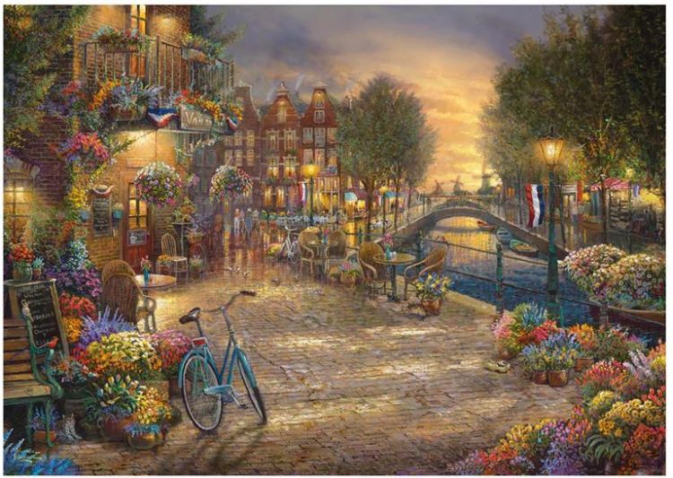 Puzzle Schmidt: Thomas Kinkade - Amsterdam, 1000 piese - Amsterdam este un adevărat tărâm al minunilor. Alice ar fi impresionată de acest oraș al lalelelor multicolore, absolut superb primăvara. Din 1862, celebra piață de flori din Amsterdam, capitala Olandei, este locul preferat pentru locuitorii acestui frumos oraș pentru a cumpăra plante și flori. Nu doar buchete, flori libere și legume cultivate pot fi găsite acolo, ci și semințe și bulbi pentru a ne planta singuri. Astăzi nu mai este doar o simplă piață de flori, ci și o atracție turistică populară. O ilustratie minunata din partea lui Thomas Kinkade.