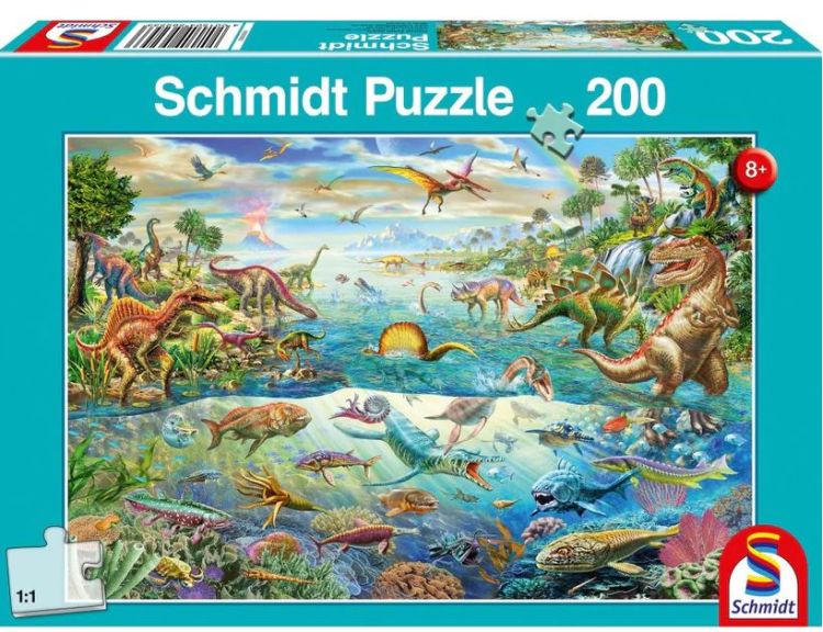 Puzzle Schmidt: Descopera dinozaurii, contine 200 piese de puzzle. Dinozaurii au aparut pentru prima data in perioada Triasica, cu 243233 milioane de ani in urma. Acest puzzle va ajuta sa descoperiti o multime de specii de dinozauri care au trai in apa, pe pamant, respectiv in aer.