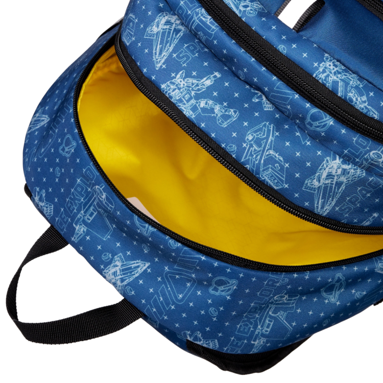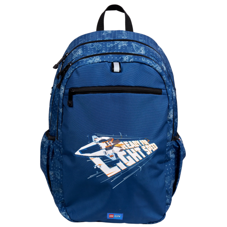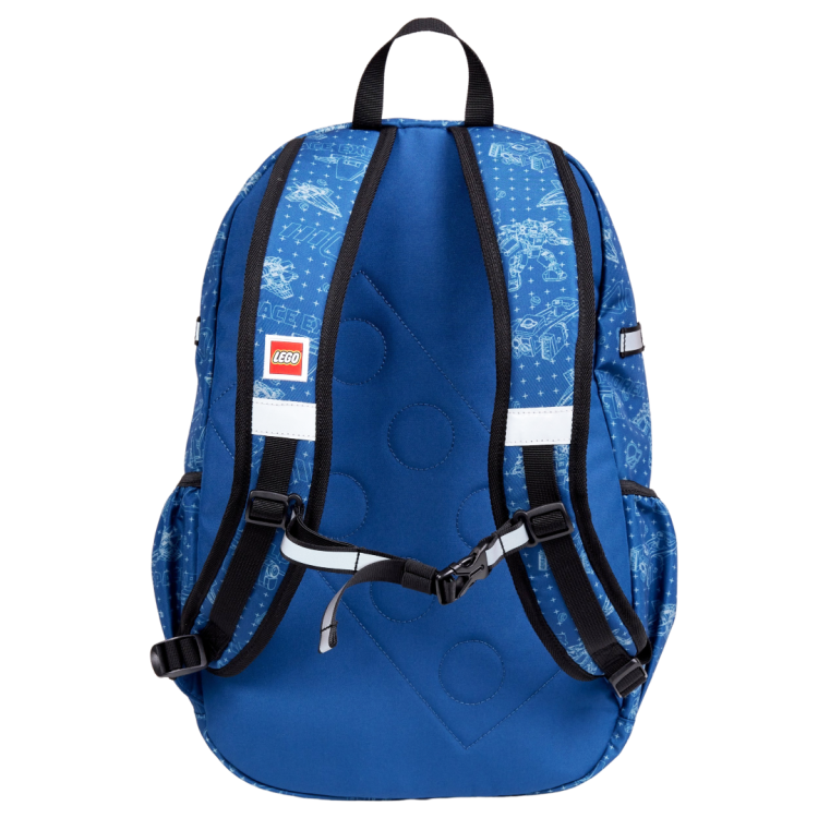 Rucsacul dispune de 2 compartimente principale, un buzunar frontal mic cu fermoar pentru obiecte de valoare si 2 buzunare laterale din plasa, ideale pentru sticle de apa sau alte lucruri marunte. Panoul din spate este captusit si respirabil, decorat cu un model inspirat de caramizile LEGO. Bretelele sunt reglabile si captusite, iar elementele reflectorizante pe toate cele patru laturi asigura o vizibilitate sporita.