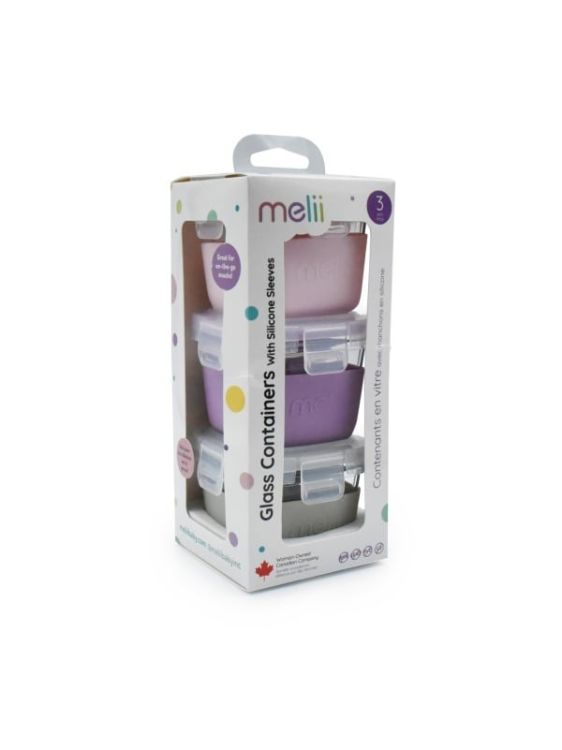 -SET 3 RECIPIENTE STICLA 3 160ML CU HUSA ANTIDERAPANTA SILICON MELII ROZ MOV GRI