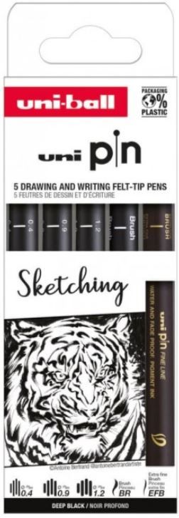 -Set 5x Liner UNI PIN-200 ASP017, pe baza de apa, varf 0. 4-1. 2mm + pensula + pensula extra-fin, negru