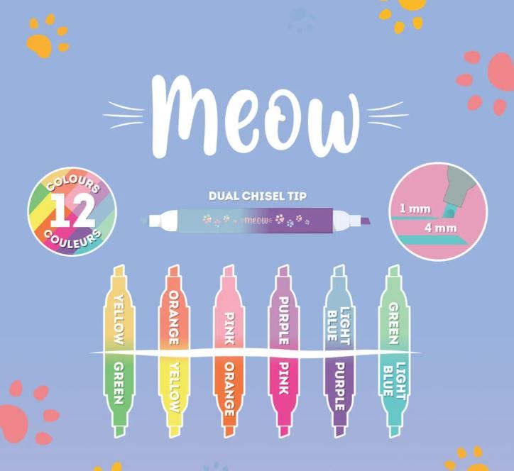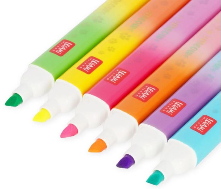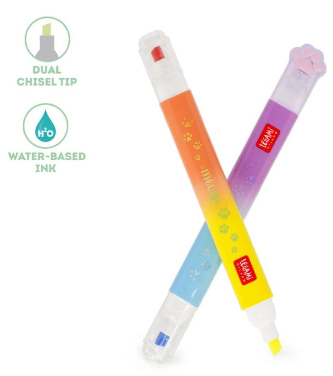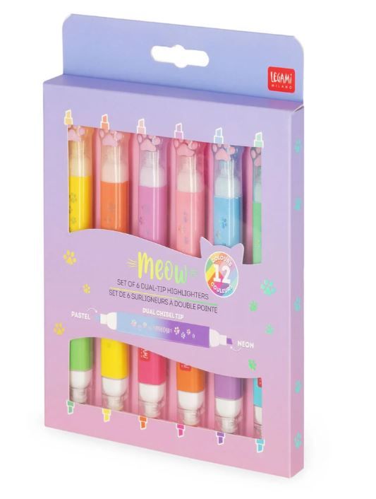 Setul de 6 evidențiatoare cu vârf dublu pastel și neon Meow de la Legami va sări ca o pisică pentru a evidenția cele mai importante informații și va toarce pe fiecare pagină a notițelor tale.