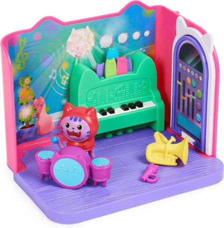 Cuprinde un set de tobe, un pian cu pisicute care danseaza cand apesi clapele, precum si un tonomat pliabil care se transforma intr-un super podium pentru karaoke. Deschide-ti cutiutele speciale de la Casa de papusi, la fel ca Gabby, si gaseste doua accesorii muzicale surpriza: un microfon roz si o tuba galbena, pentru si mai multa distractie muzicala. Cuprinde: 1 camera, 1 figurina, 2 piese de mobilier, 2 cutiute cu surprize pentru casa de papusi, 2 accesorii si 1 foaie cu instructiuni