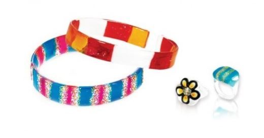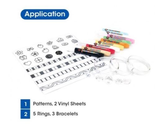 5 inele și 2 brățări din plastic transparent, coli plastic și pliant cu modele, pliant cu instrucțiuni.