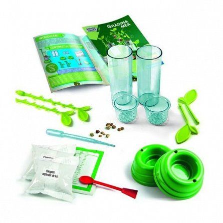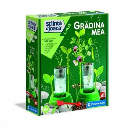 Seturile Stiinta & Joaca imbina distractia cu educatia! Cu setul Gradina mea de la AS, copilul va putea experimenta cu tehnica inovatoare hidroponica si cultiva plantele in apa, observand si monitorizand zilnic cresterea plantelor si dezvoltarea radacinilor. Setul contine: vase transparente, recipiente cu orificii de scurgere, farfurioare pentru vasele transparente, punga cu compost de lut, betisoare de sustinere, pipeta, spatula, punga cu seminte si un manual de instructiuni bogat ilustrat, pentru a ajuta copiii in realizarea celor mai fascinante experimente si a cultiva plantele fara sol! Setul este recomandat copiilor de la 8 ani.