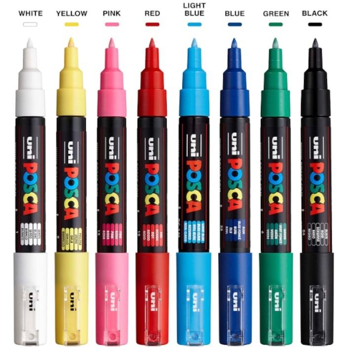 -Set markere pe baza de apa UNI PC-1M 0. 7 mm, 8 culori de baza, Posca