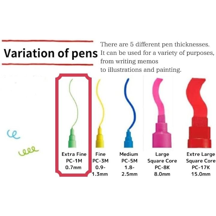 Varful subtire este ideal pentru lucrari de dimensiuni mici sau detalii. PC-1MC este carioca Posca ideal pentru creatii de format mic, cu dimensiunile lui mici si cu varful extra-fin. Este apreciat de adulti si copii, incepatori sau profesionisti care il folosesc pentru care il folosesc pentru detalii, contururi sau colorat.
