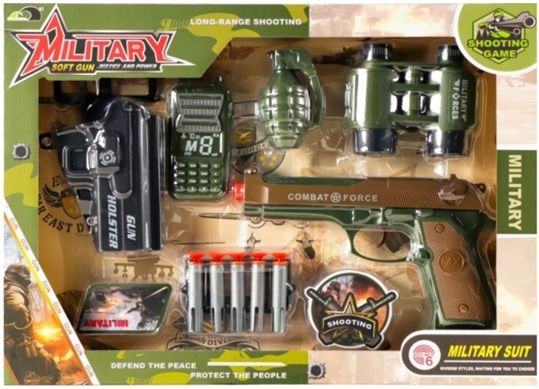 Jocul cu setul militar MEGA CREATIVE va oferi fiecărui copil o doză mare de distracție: pistol, toc pentru pistol, binoclu, grenadă, walkie-talkie, 5x gloanțe din spumă.
