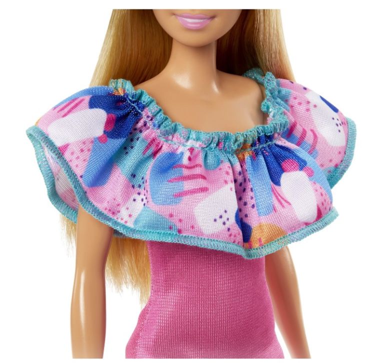 Papusa Barbie, mereu fabuloasa, poarta o rochie fara umeri, cu un guler cu volane si adidasi, aducand un stil elegant si indraznet.