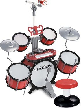 Set tobe cu tastatura electronica DJ, microfon si scaun. Set tobe: toba; 270 mm cu pedala. 2 tobe laterale; 180 mm. 2 tobe laterale; 140 mm. 1 Chimba; 190 mm. 1 Chimbal ; 140 mm. 2 tobe laterale. Livrat cu scaun. Tastatura electronica: 8 taste. Polifonie: 4 note. 2 sunete. 8 ritmuri de tobe. 8 ritmuri cu aranjament. 8 melodii demonstrative. Okon (functie cu o tasta-o nota). 10 lumini ritmice. Reglati volumul general. Volum tobe. Volum aranjament. Scratch pad cu 4 efecte sonore. 3 efecte de chitara. Suport muzical inclus. Mufa pentru sursa audio externa (MP3 player, smartphone etc.) - cablu inclus. Priza microfon. Oprire automata. Alimentare: 3 Baterii R6/AA 1. 5V (nu sunt incluse). Dim: 760x400x850 mm