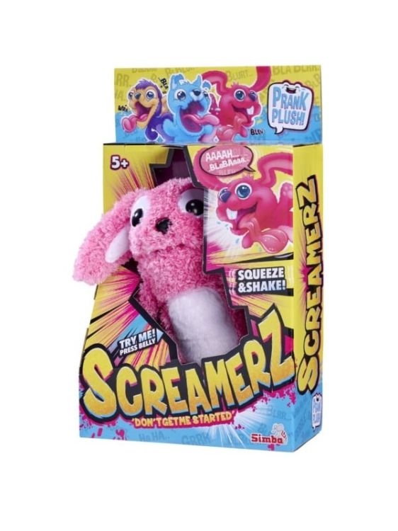 Jucariile moi electronice dragalase ScreamerZ arata dragut si adorabil. Iepurele are blana roz pufoasa, urechi proeminente si ochi mari si nebuni. Atunci cand apasati usor pe stomac, emite zgomote puternice. Daca apasati putin mai tare pe stomac, animalul de plus incepe sa tipe puternic. Cand este scuturat, animalul de plus scoate un tipat amuzant si clatinat.