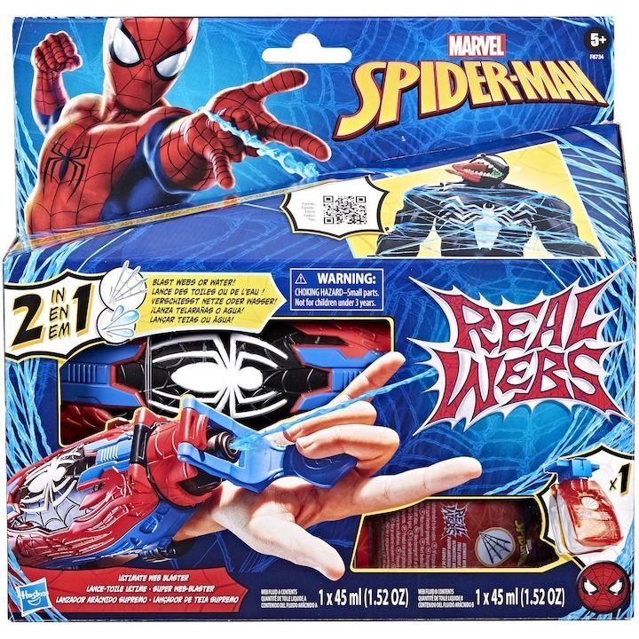 Esti gata sa tintesti panze reale, la fel ca Omul Paianjen? Acest blaster cu panze Omul Paianjen are un lichid inovator pentru panze, care se transforma intr-un gel asemanator cu panza, cu care te poti juca! Acest blaster are cea mai recenta tehnologie de lansare a panzei si 3 moduri de joc. Copiii cu varsta de la 5 ani in sus pot sa isi puna blasterul pe incheietura mainii, sa se aseze in cea mai buna postura de tintire a Omului Paianjen si sa apese butonul pentru a lansa panze sau apa! Joaca-te cu panze si imagineaza-ti capturarea celui mai recent dusman al Omului Paianjen foloseste panza pentru a infasura figurinele sau seturile de joaca (fiecare se comercializeaza separat) pentru a crea propria ta lume fantastica, in care tu esti Omul Paianjen! Blasterul include 1 rezerva Real Webs (rezervele se comercializeaza separat) si 1 rezerva reutilizabila pentru apa. Acest blaster cu panze Ultimate Web reprezinta un cadou Omul Paianjen extraordinar pentru baieti si fete si poate aduce un plus de distractie si de actiune costumelor Omul Paianjen sau folosit impreuna cu o masca Omul Paianjen!