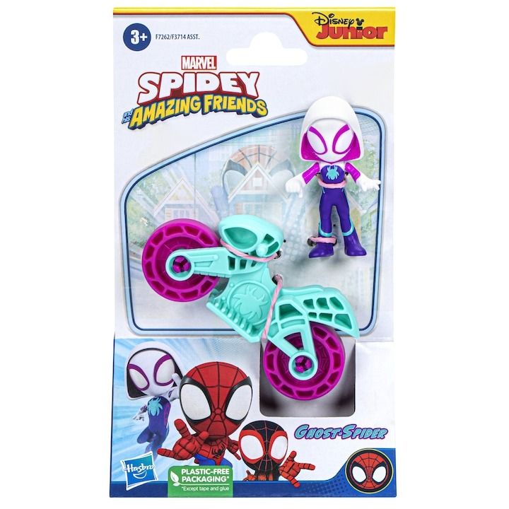 Este timpul Spidey! Aceste jucarii Spidey and His Amazing Friends vin cu o silueta si o motocicleta pentru o joaca plina de actiune. Silueta de 2, 5 inci poate merge cu adevarat cu bicicleta, astfel incat prescolarii isi pot imagina ca se vor ajuta cu echipa Spidey. Cu aceste seturi de figurine si vehicule Marvel prescolare, distractia este la o plimbare distanta! Aceste seturi de jucarii Spidey sunt cadouri grozave de sarbatori sau de ziua de nastere pentru copiii de la 3 ani in sus, care iubesc aventurile lui Spidey, Miles Morales Spider-Man, Ghost-Spider si toti prietenii si dusmanii lor! Acest pachet contine personajul Ghost Spider.