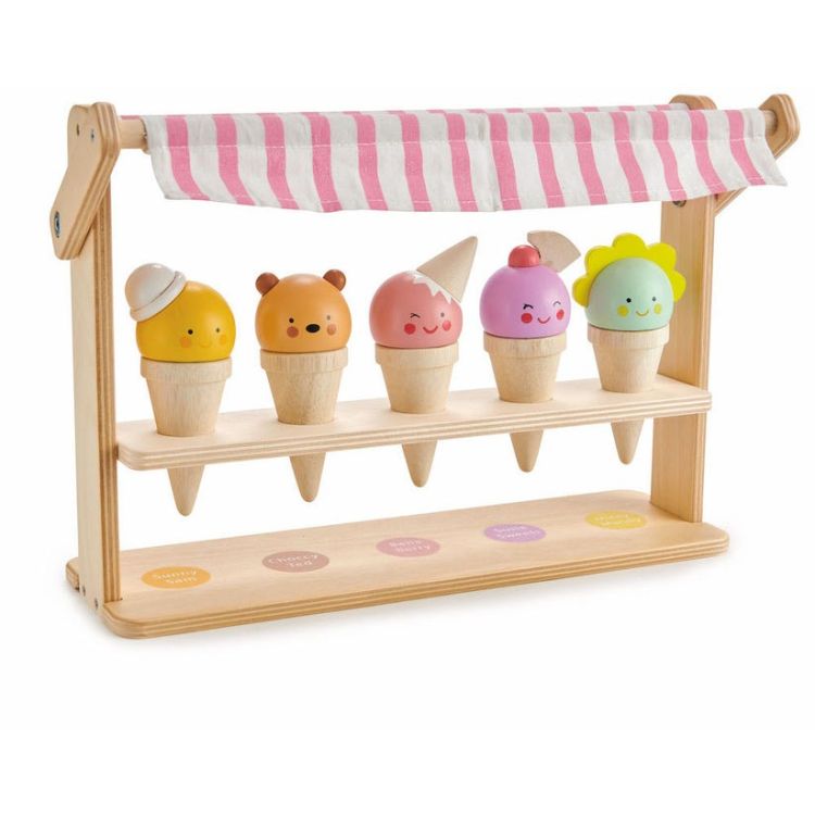Stand pentru inghetata - Scoops and Smiles, din lemn premium. Ce cornet vei alege? Cinci delicioase si foarte prietenoase cornete de inghetata din lemn impodobesc acest mic magazin. Alege-ti aroma si distreaza-te potrivind personajele la numele lor.