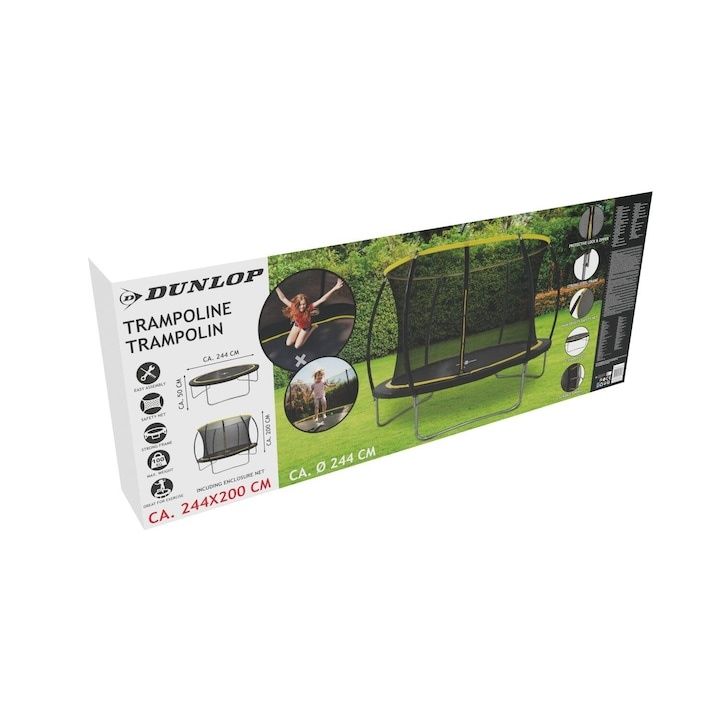 Trambulina Dunlop robusta, cu dimensiunile 244x200 cm, cu plasa pentru joaca in siguranta. Durabil si usor de asamblat, ideal pentru copii si adulti. Promoveaza activitatea fizica si distractia in aer liber.