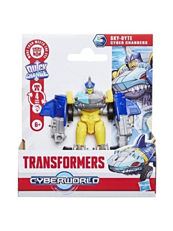 Transformers CYBERWORLD robot convertibil. In Transformers CYBERWORLD, copiii decid ce se intampla si totul incepe cu jucarii minunate precum figurinele Cyber Changers. Aceasta jucarie Transformers de 10 cm se transforma din modul robot in modul alternativ si este suficient de simpla pentru copiii cu varsta de 6 ani si peste. Ofera copiilor un plus de inspiratie pentru povestiri cu jucariile CYBERWORLD suplimentare (fiecare vanduta separat, in functie de disponibilitate) si descopera personaje unice, moduri alternative, medii si multe altele. Fanii obiectelor de colectie Transformers, precum si noii veniti, vor adora sa descopere aceasta abordare a universului Transformers, unde singura constanta este schimbarea. Acest pachet contine personajul Sky-Byte.